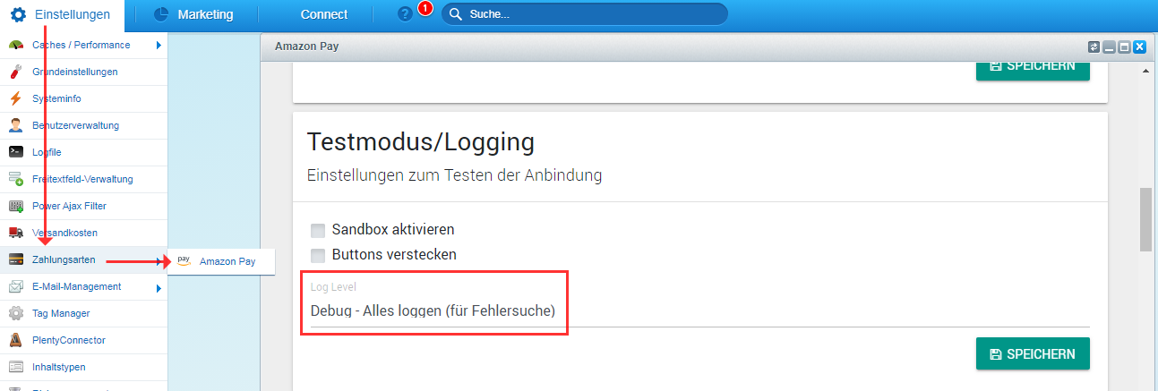 Das Log-Level kann in der Konfiguration unter Einstellungen → Zahlungsarten → AmazonPay konfiguriert werden.