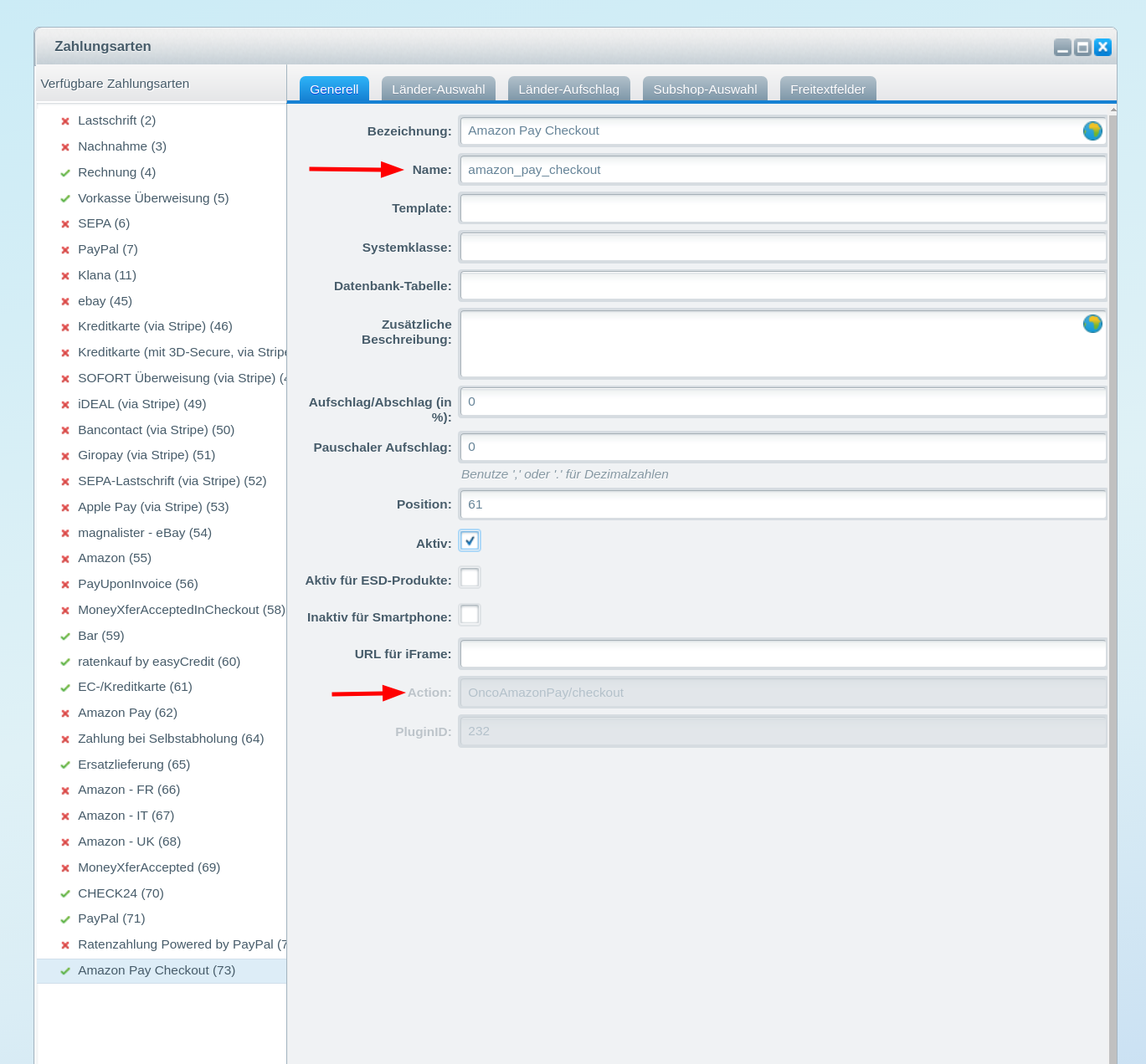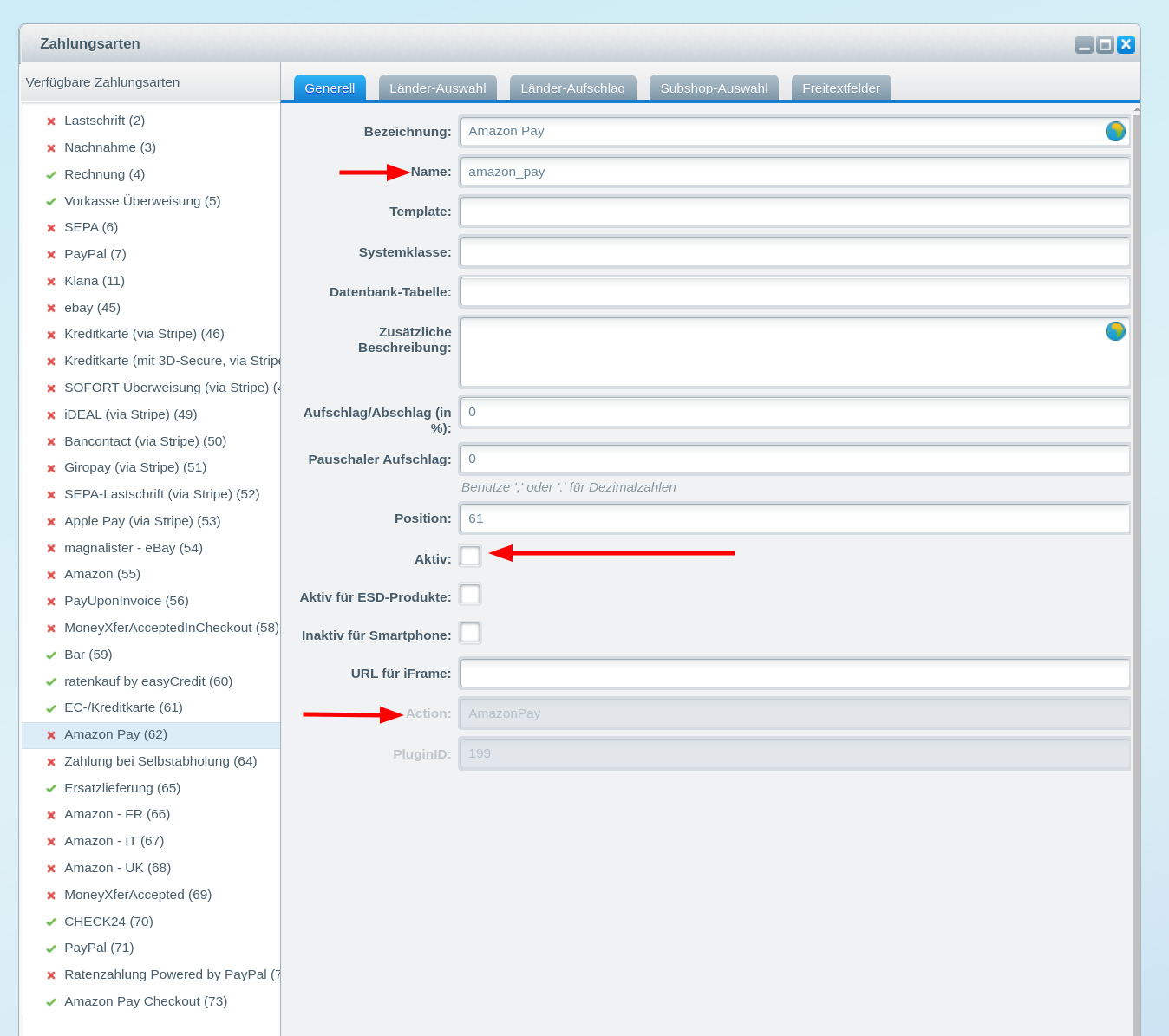 Deaktivieren Sie die bisherige Zahlungsart "Amazon Pay" unter Einstellungen » Zahlungsarten. Sie erkennen sie im Zweifelsfall an den Feldern "Name" (="amazon_pay") und "Action" (="AmazonPay"):