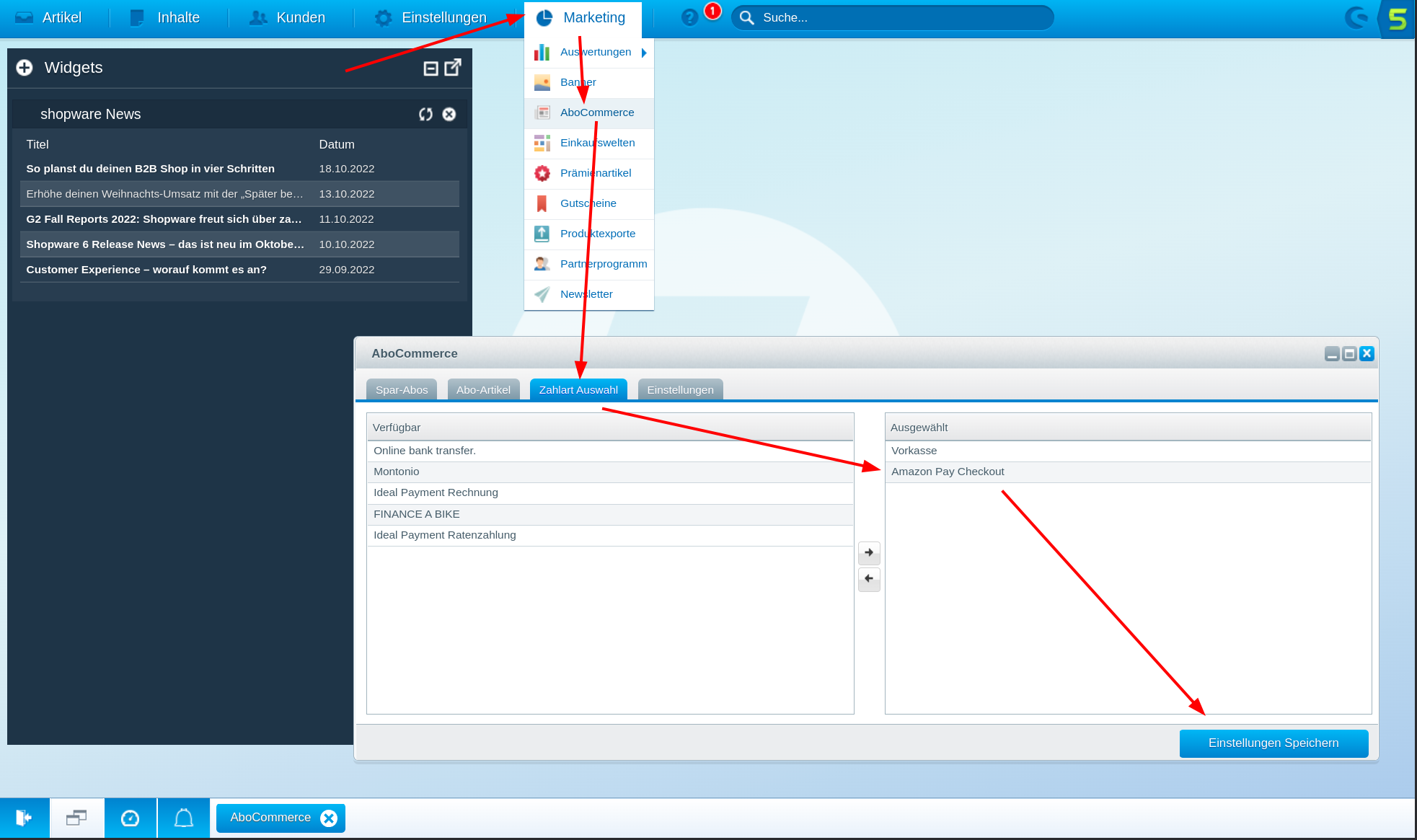 Ab Version 1.4.0 des Amazon Pay Plugins können auch Abonnements über das Shopware 5 Plugin AboCommerce (https://store.shopware.com/swagabocommerce/abocommerce.html) bezahlt werden. Dazu muss lediglich Amazon Pay als mögliche Abo-Zahlungsart hinzugefügt werden: